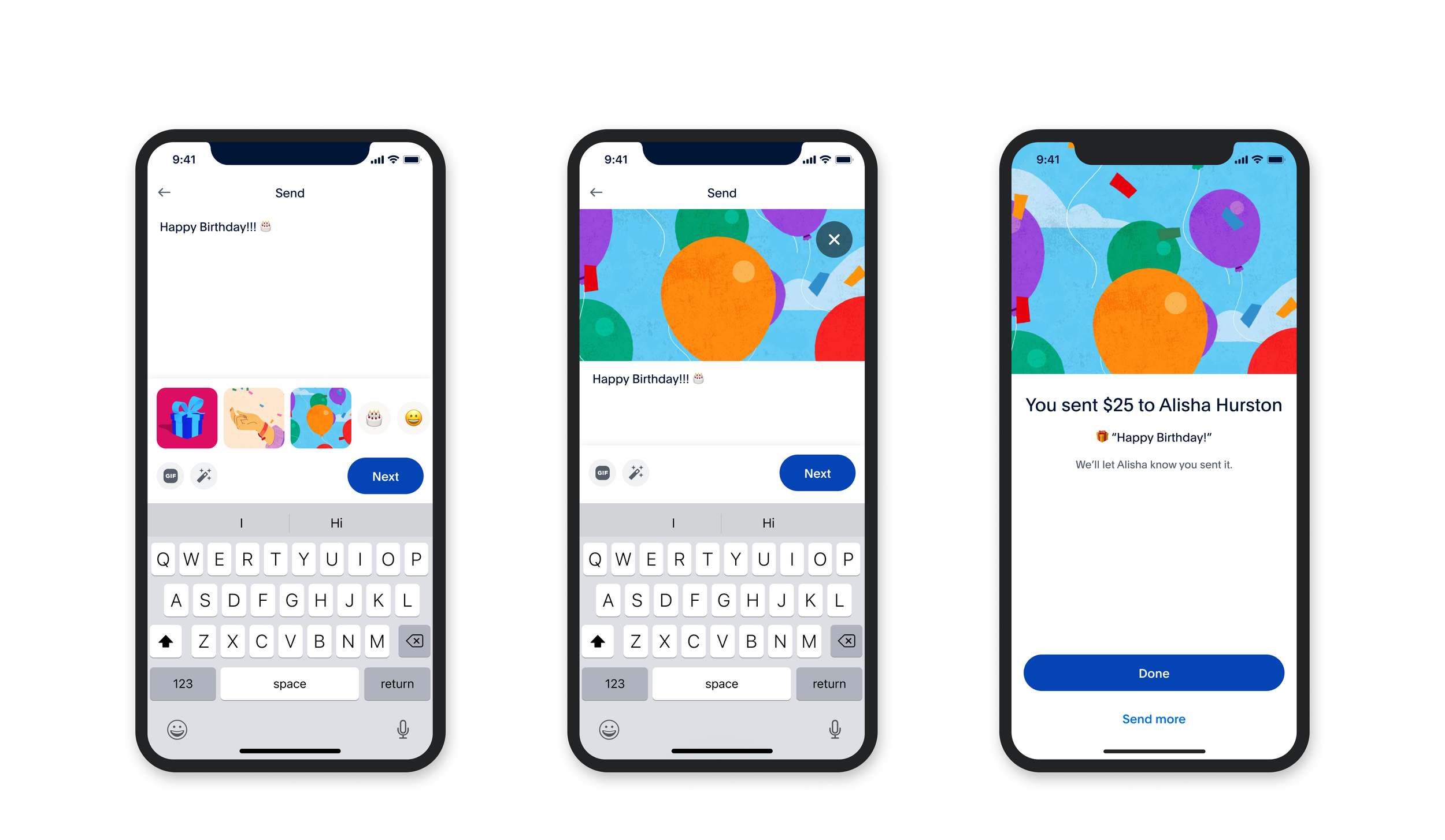 Emojis and Themes explored how rich media could be meaningfully integrated into a single P2P payment without disrupting speed or clarity. I investigated multiple media types—static emojis, animated themes, and expressive illustrations—and evaluated where they should live within the send flow, how they scale across screens, and when they should appear to enhance emotion without overwhelming the transaction. The final design balances expressiveness and restraint, introducing media at moments of intent and confirmation while preserving a fast, familiar payment experience.